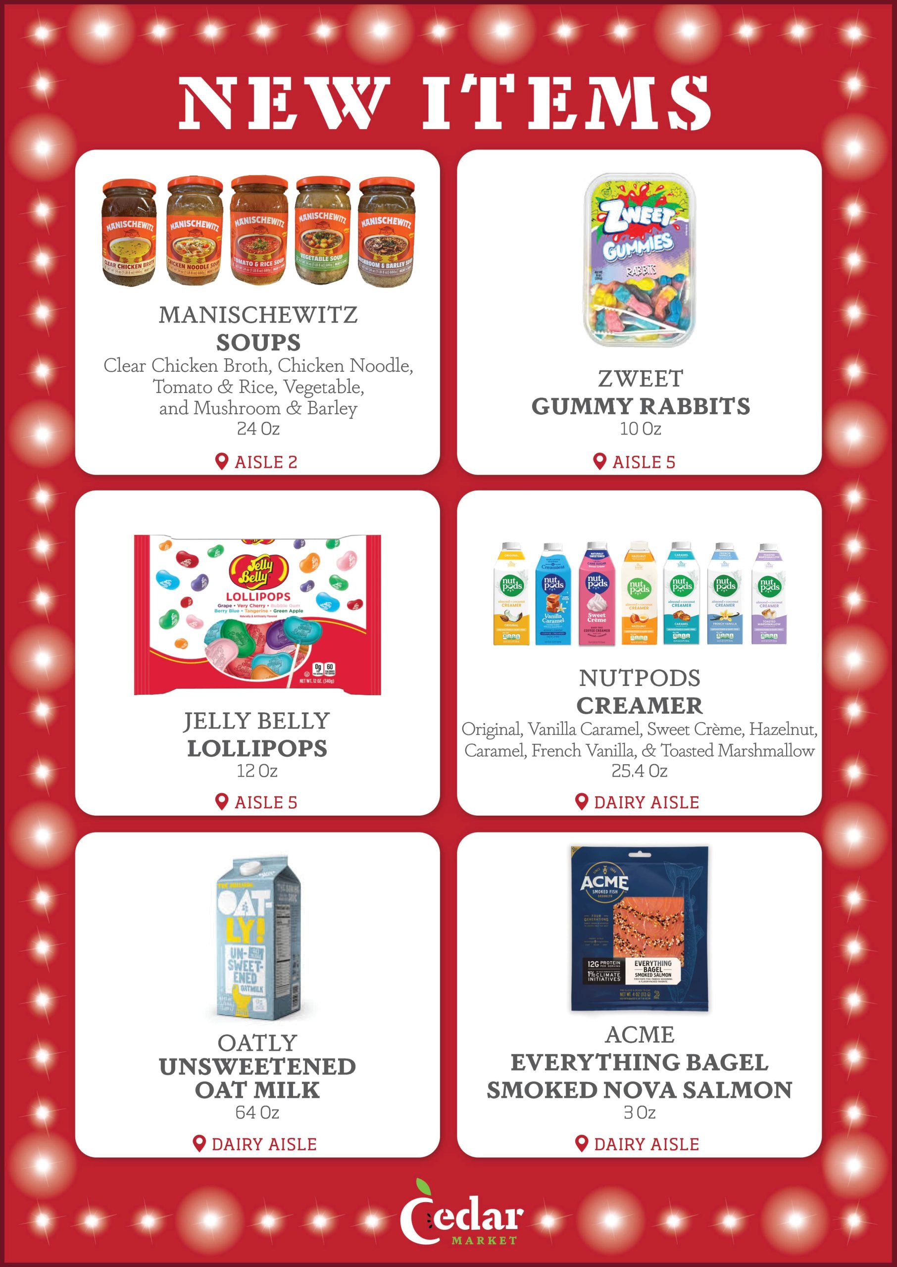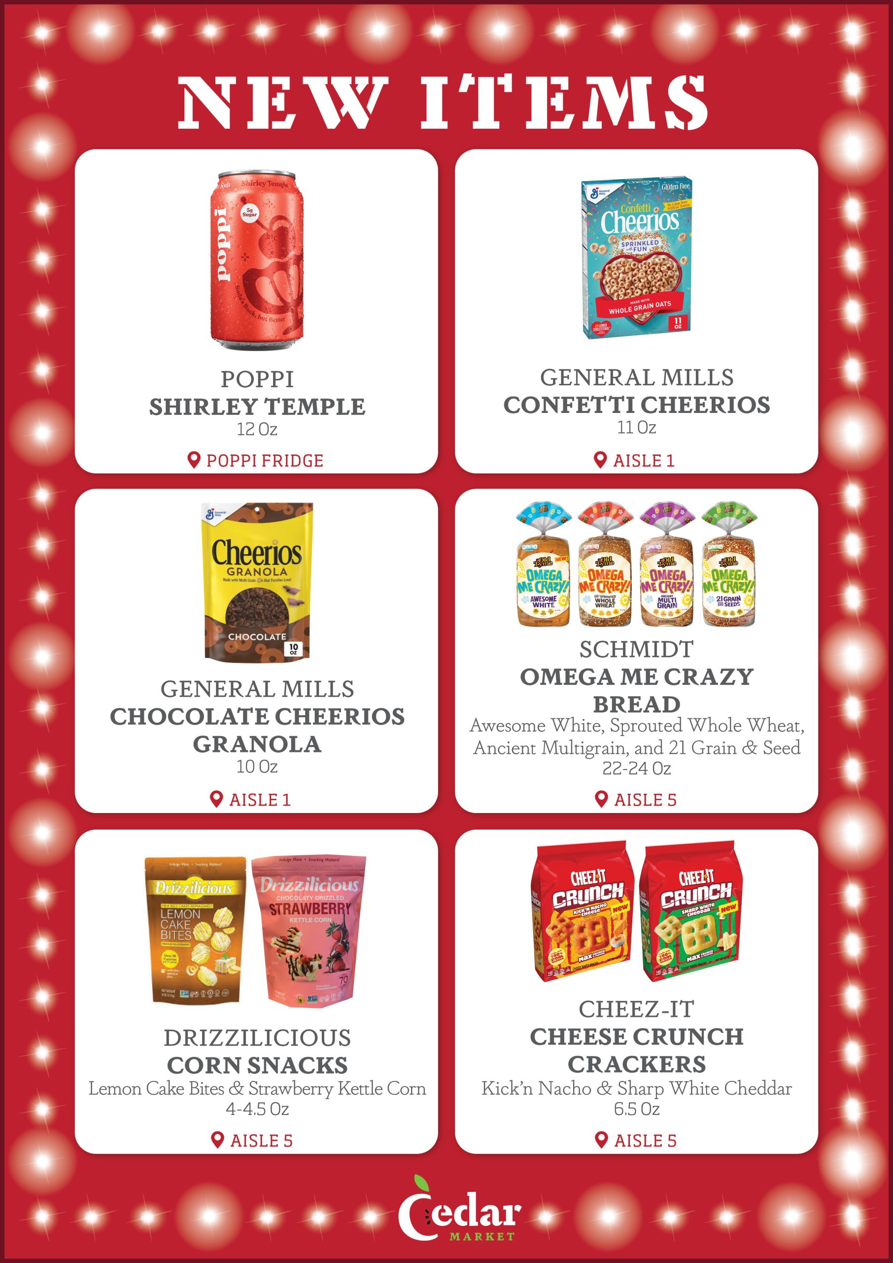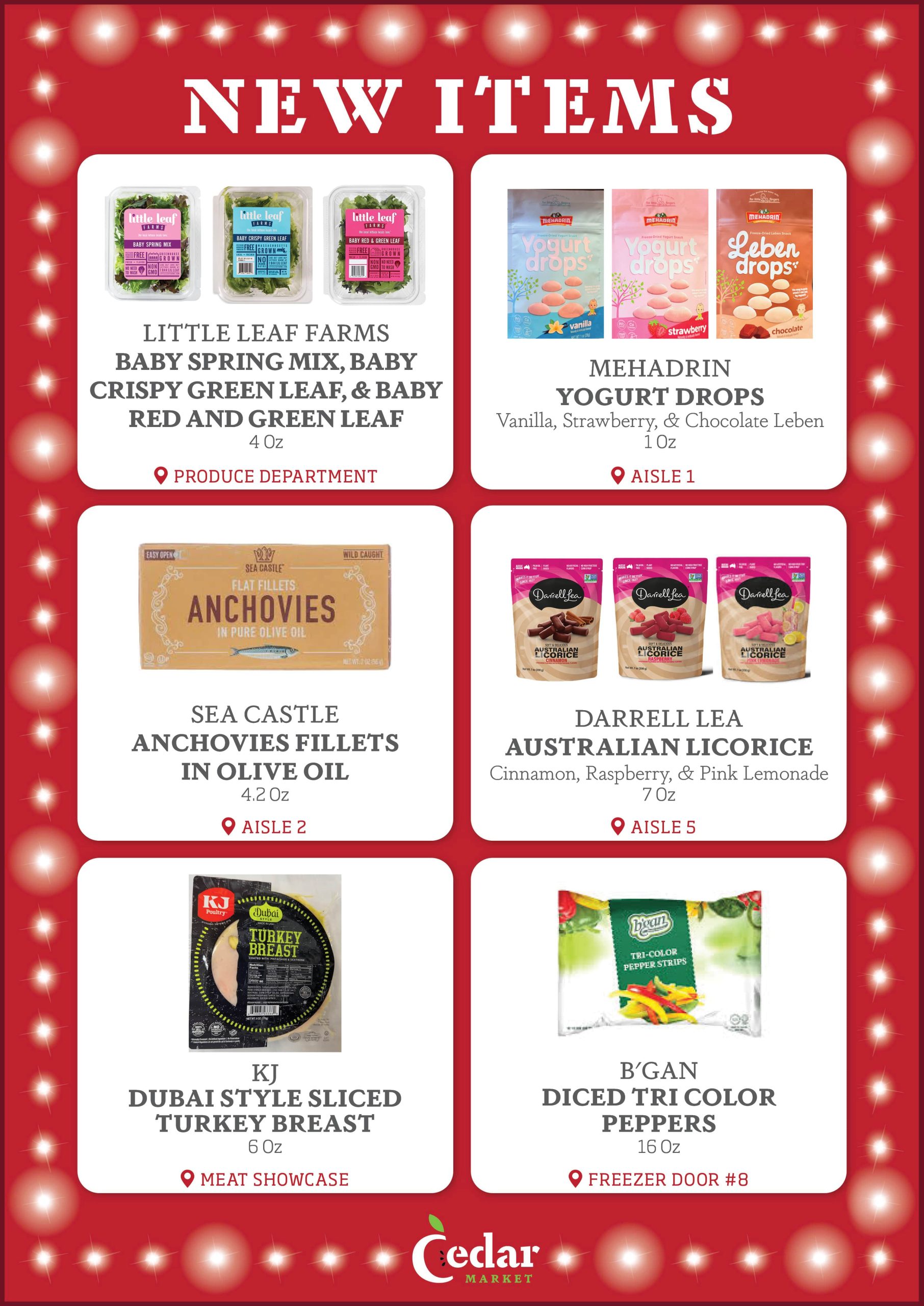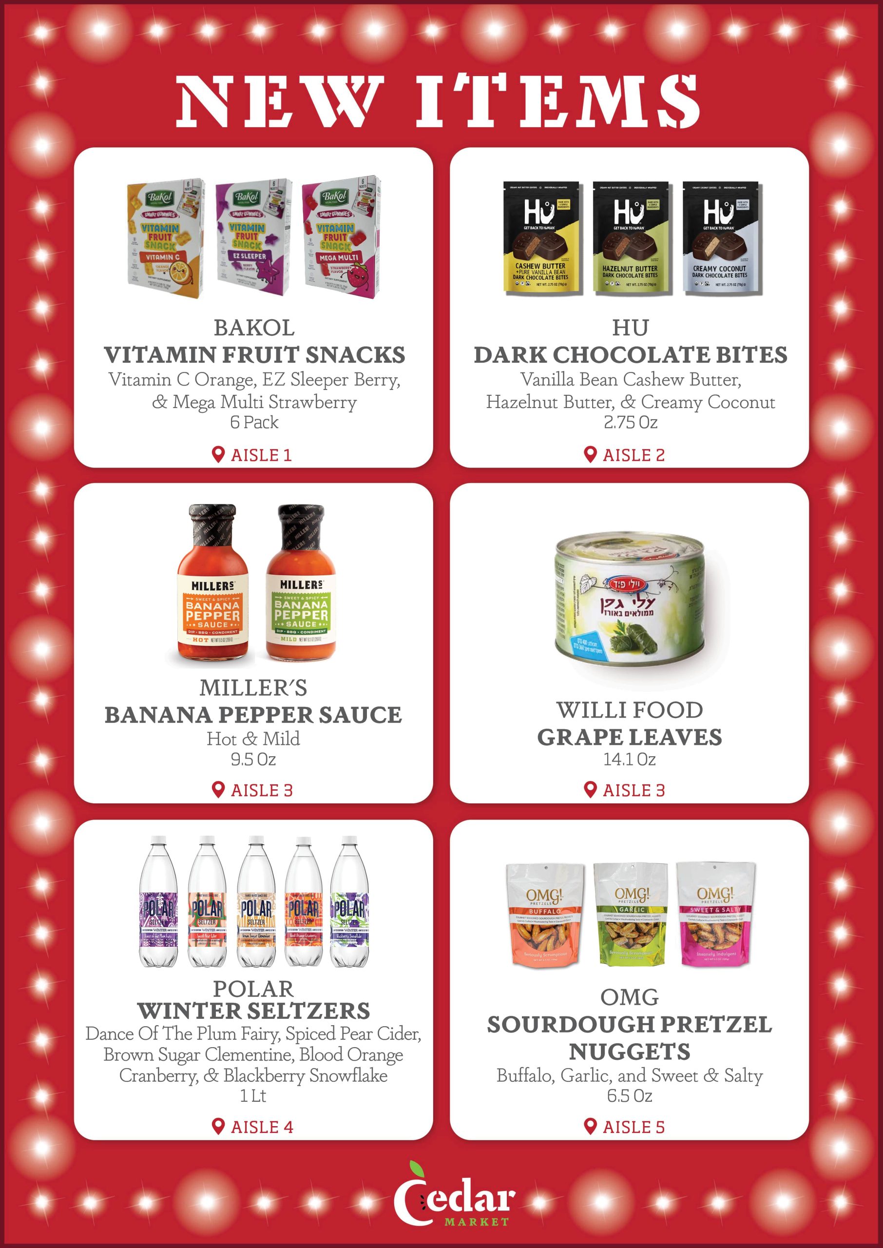 With new products constantly entering the Kosher market, the purchasing team at Cedar Market is always looking for new items to make available to you in our store. Each week, we provide our customers with a list of several New Items, now available. Additionally, we display signage in our store by the recently added new items, so that customers can see which products are new to market. Enjoy!