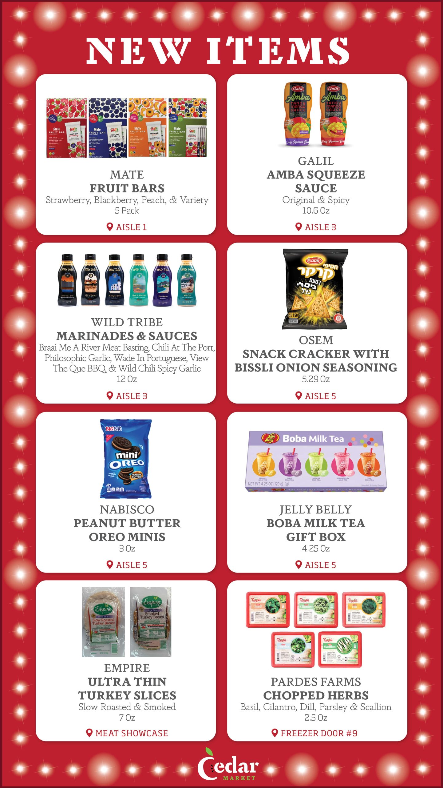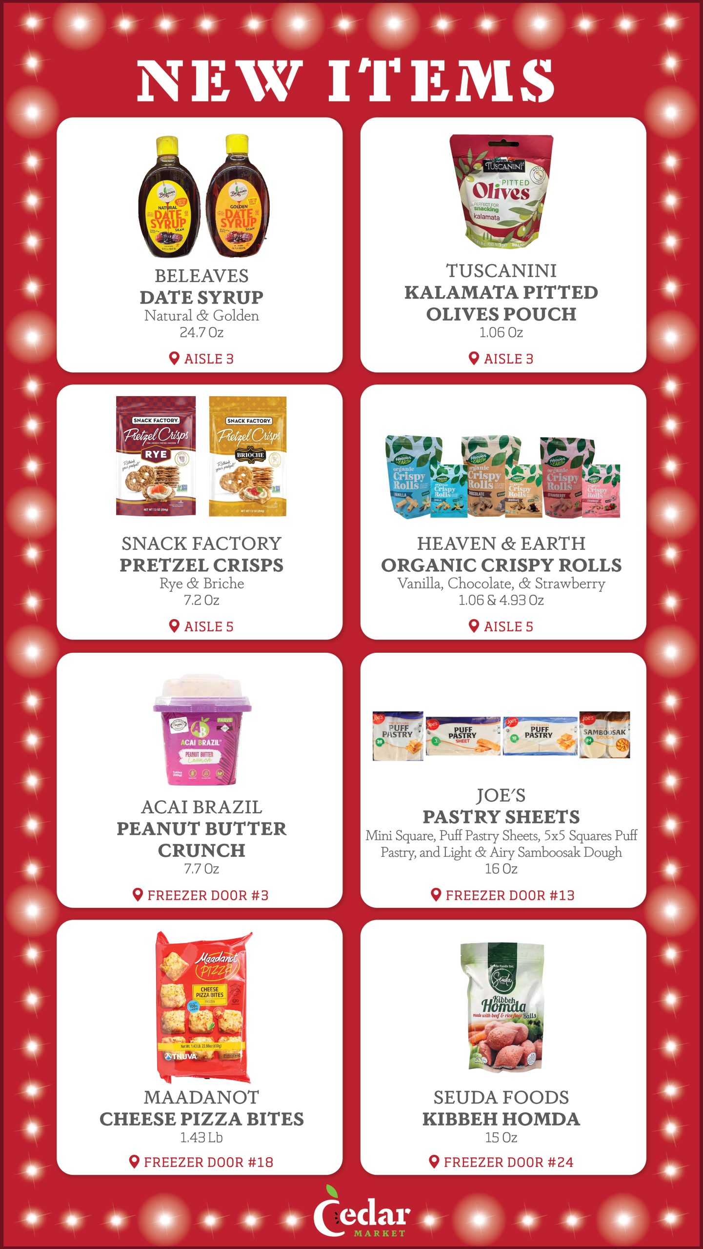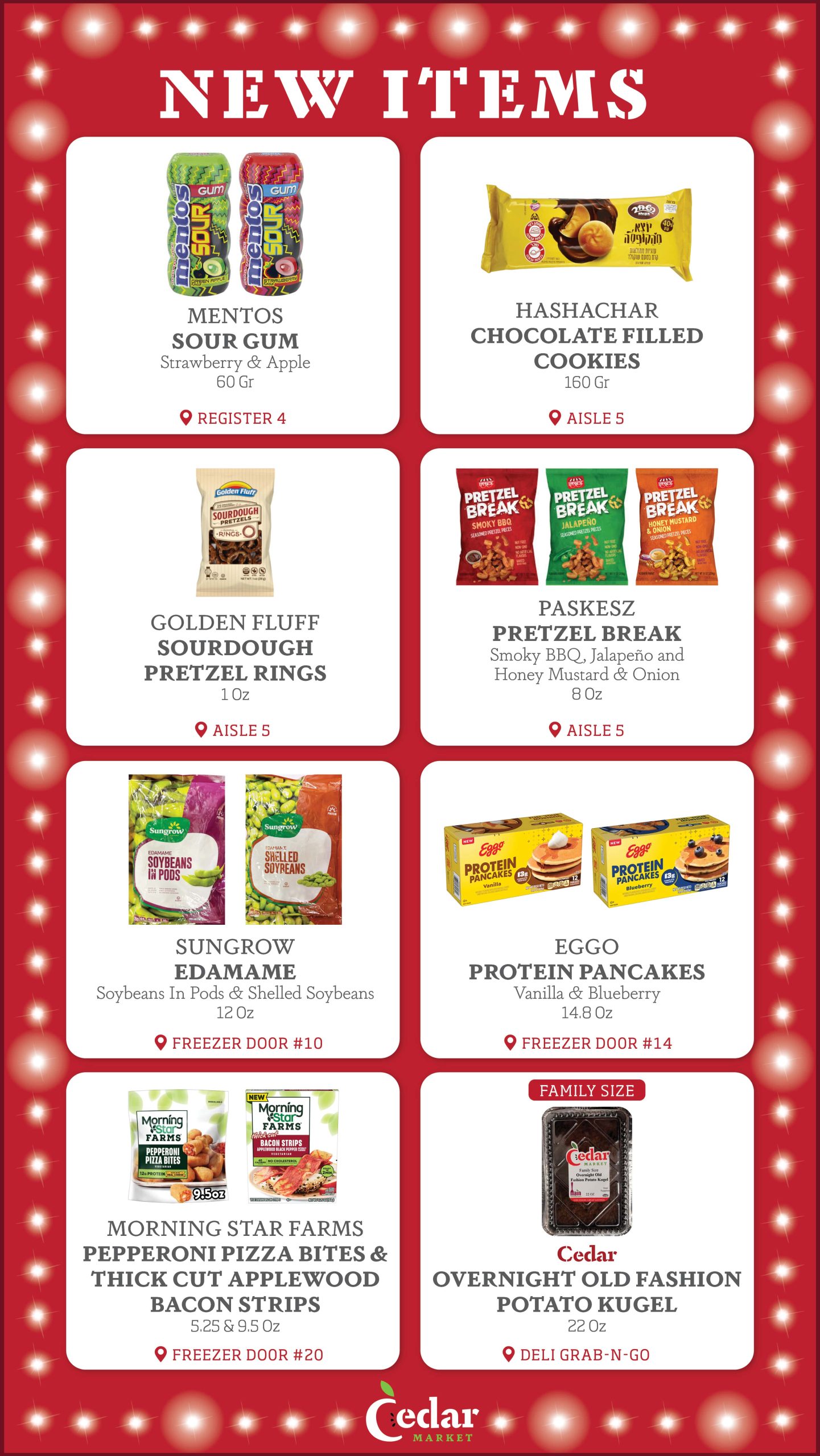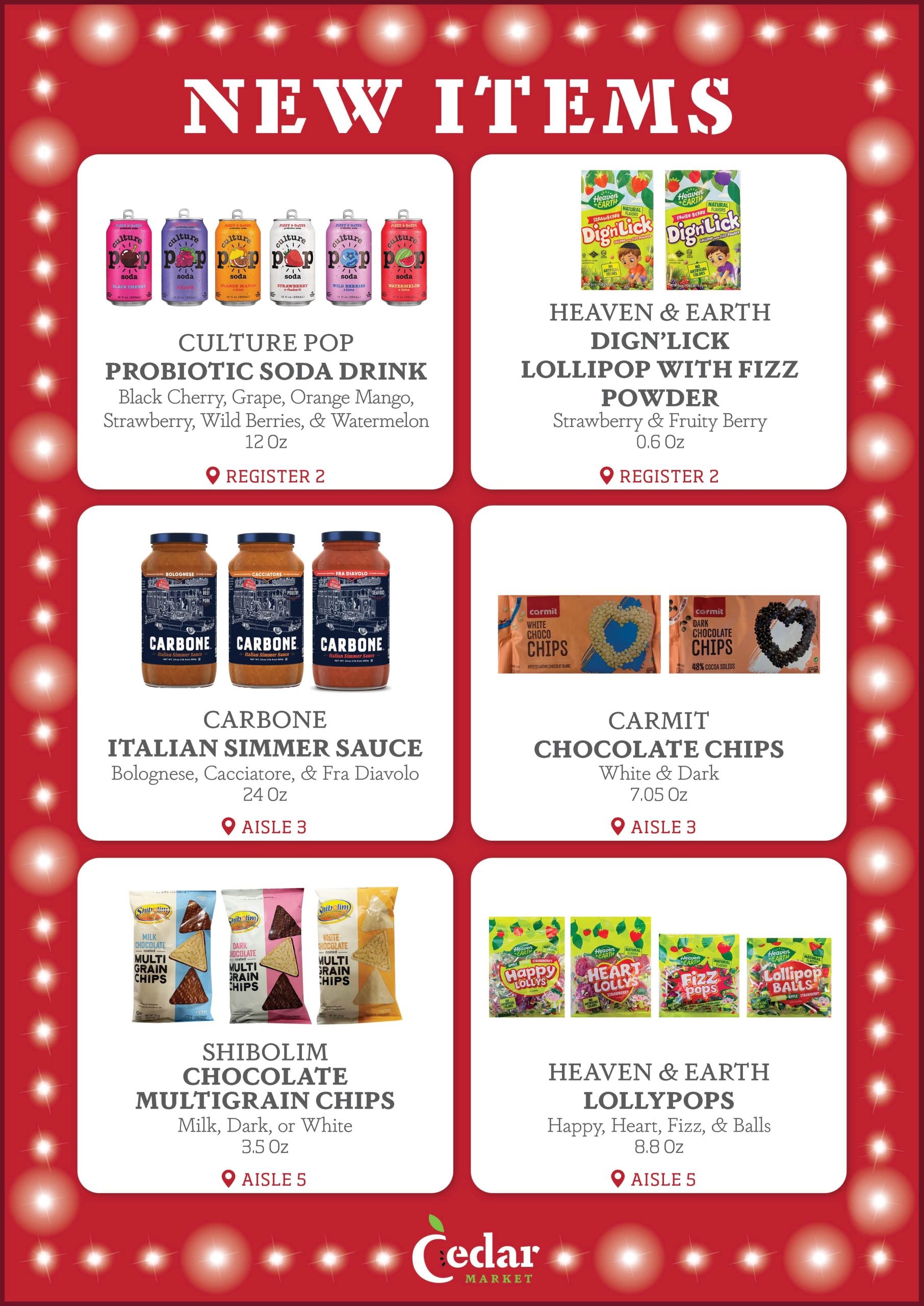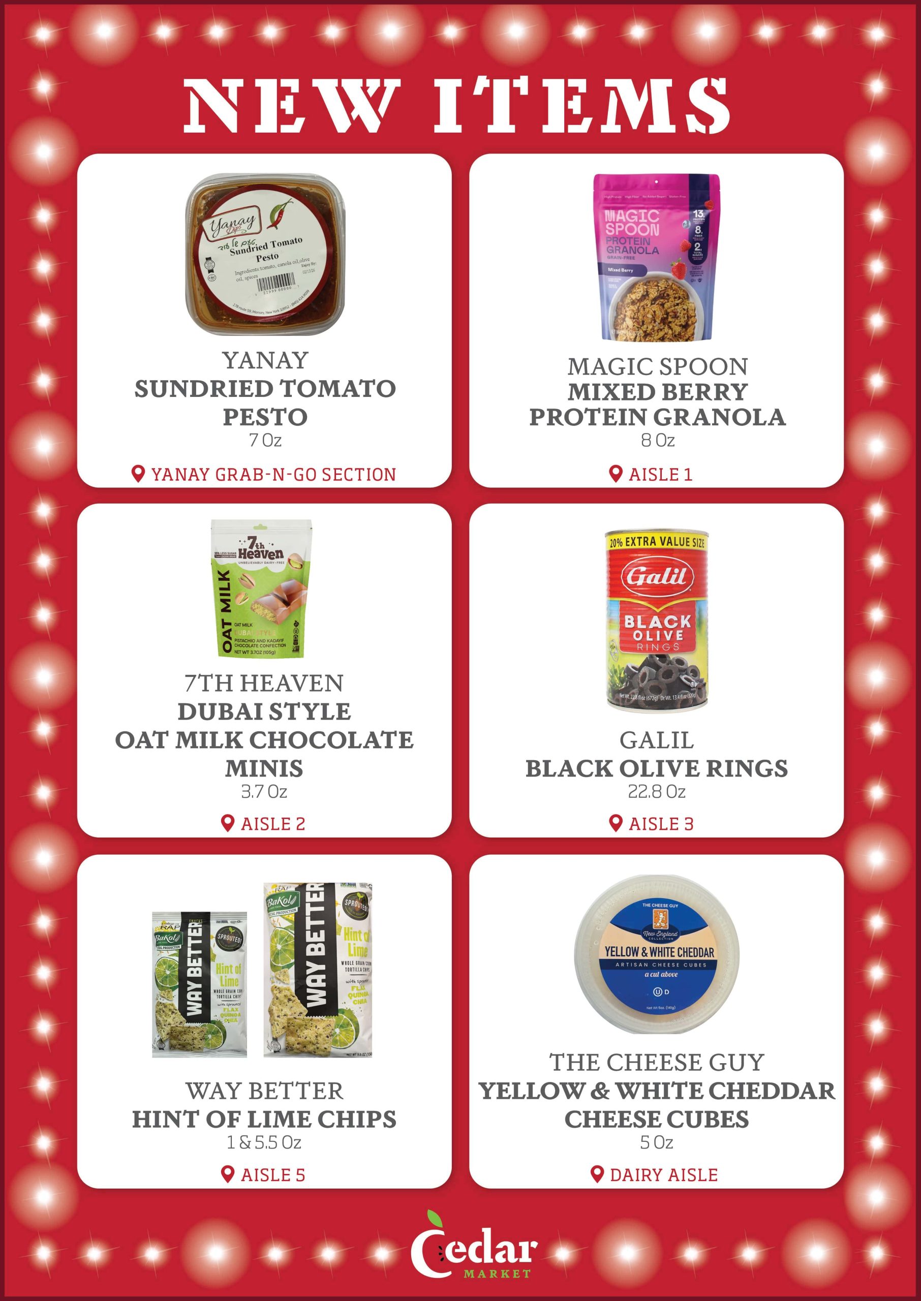 With new products constantly entering the Kosher market, the purchasing team at Cedar Market is always looking for new items to make available to you in our store. Each week, we provide our customers with a list of several New Items, now available. Additionally, we display signage in our store by the recently added new items, so that customers can see which products are new to market. Enjoy!