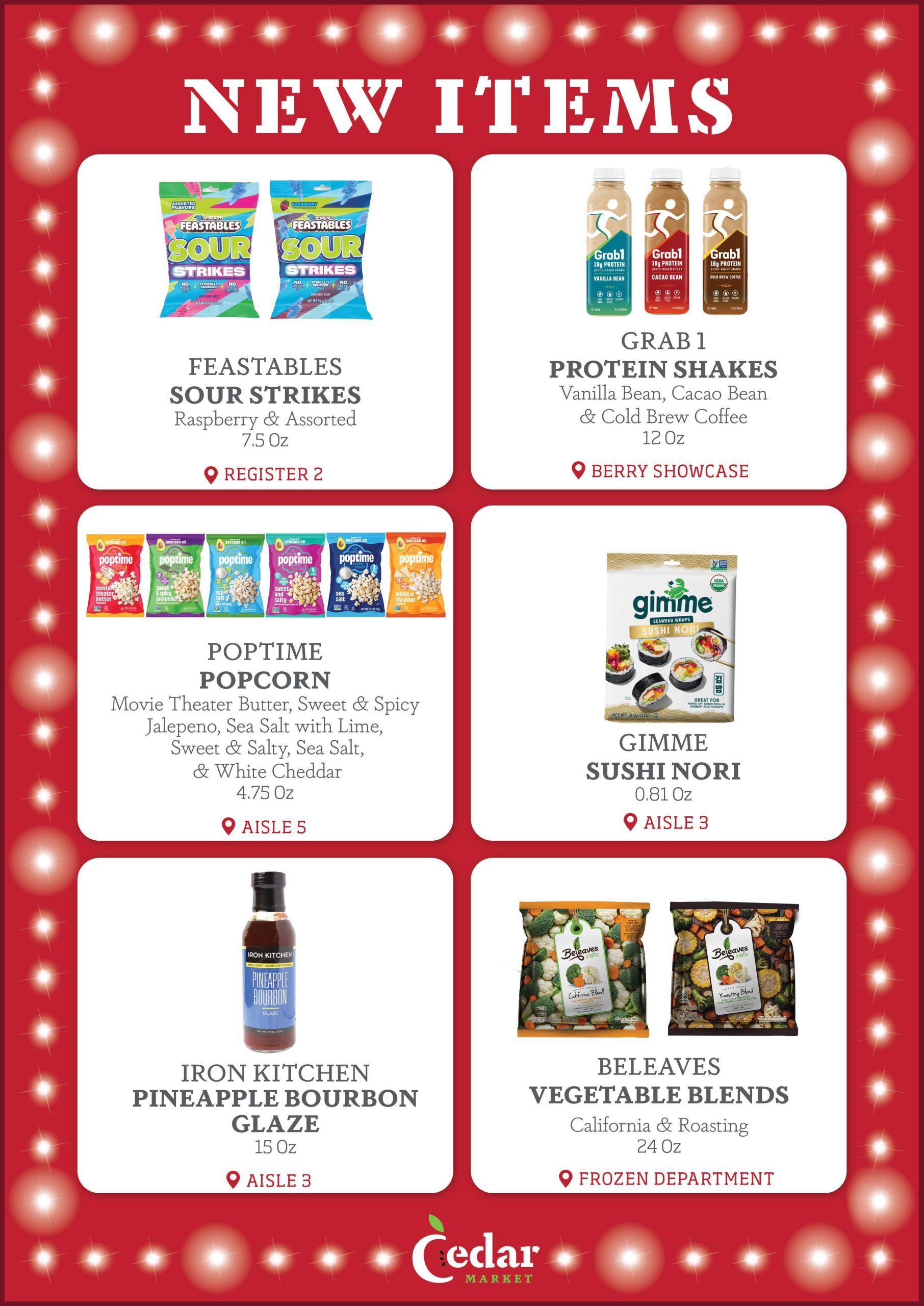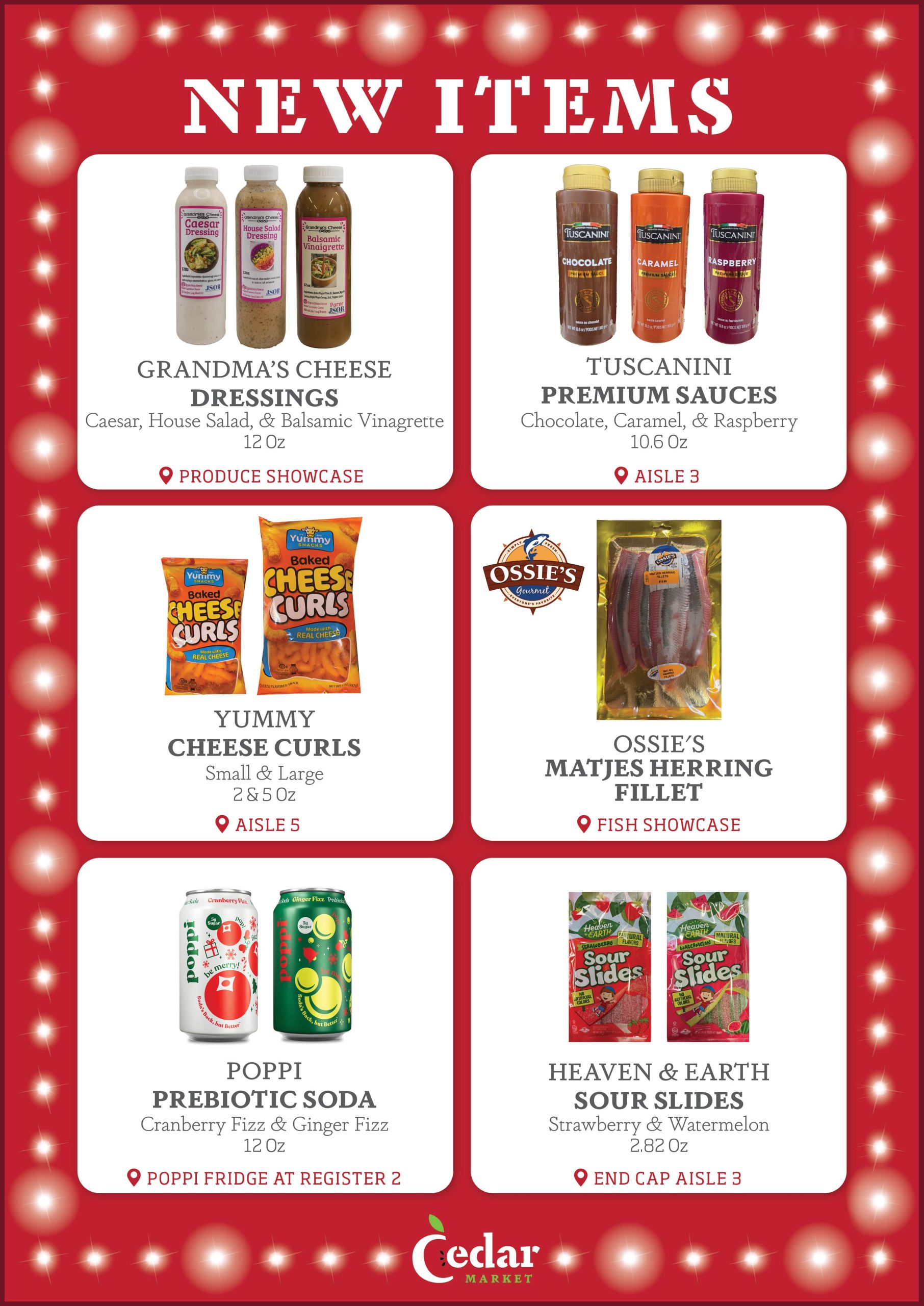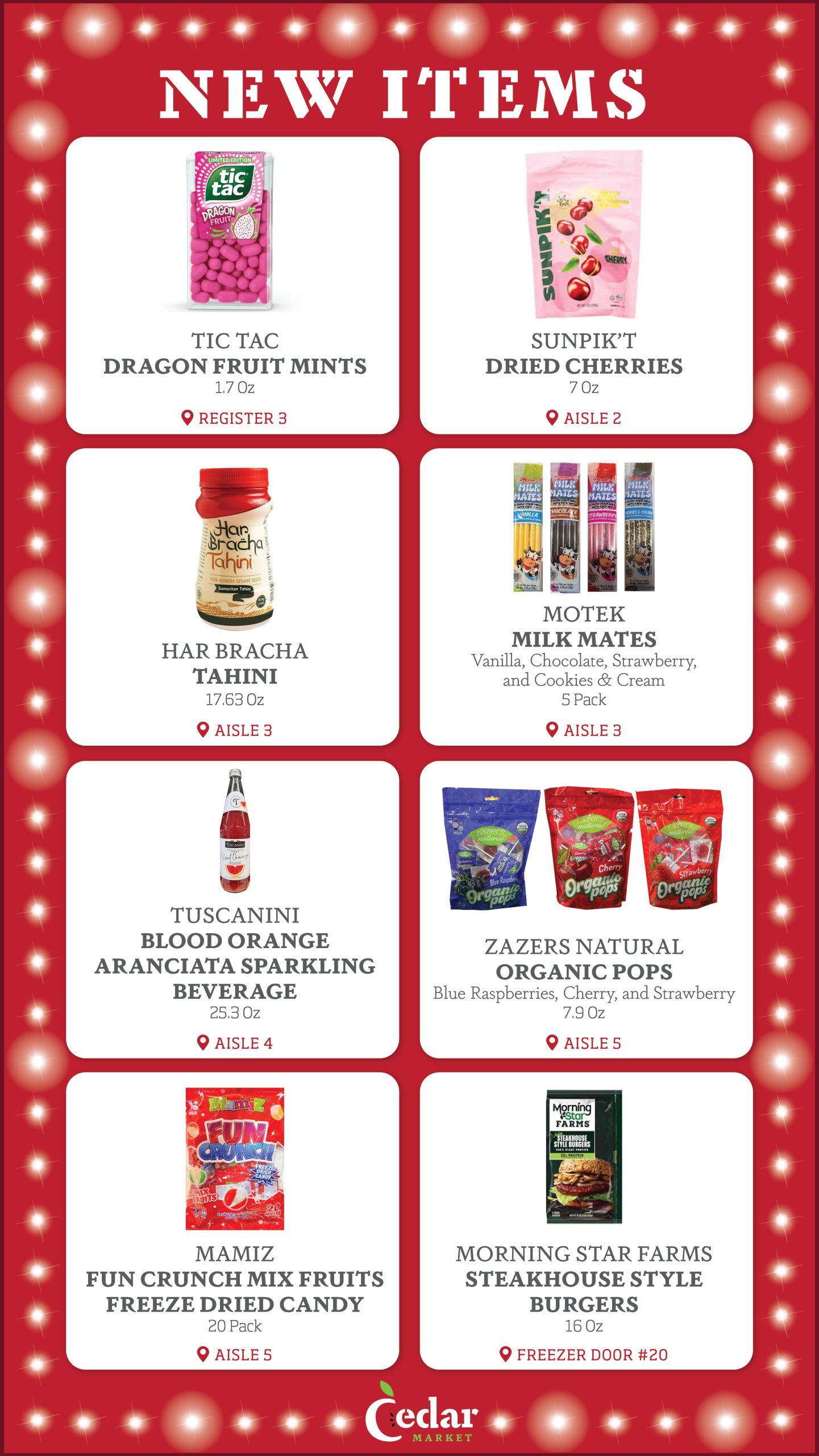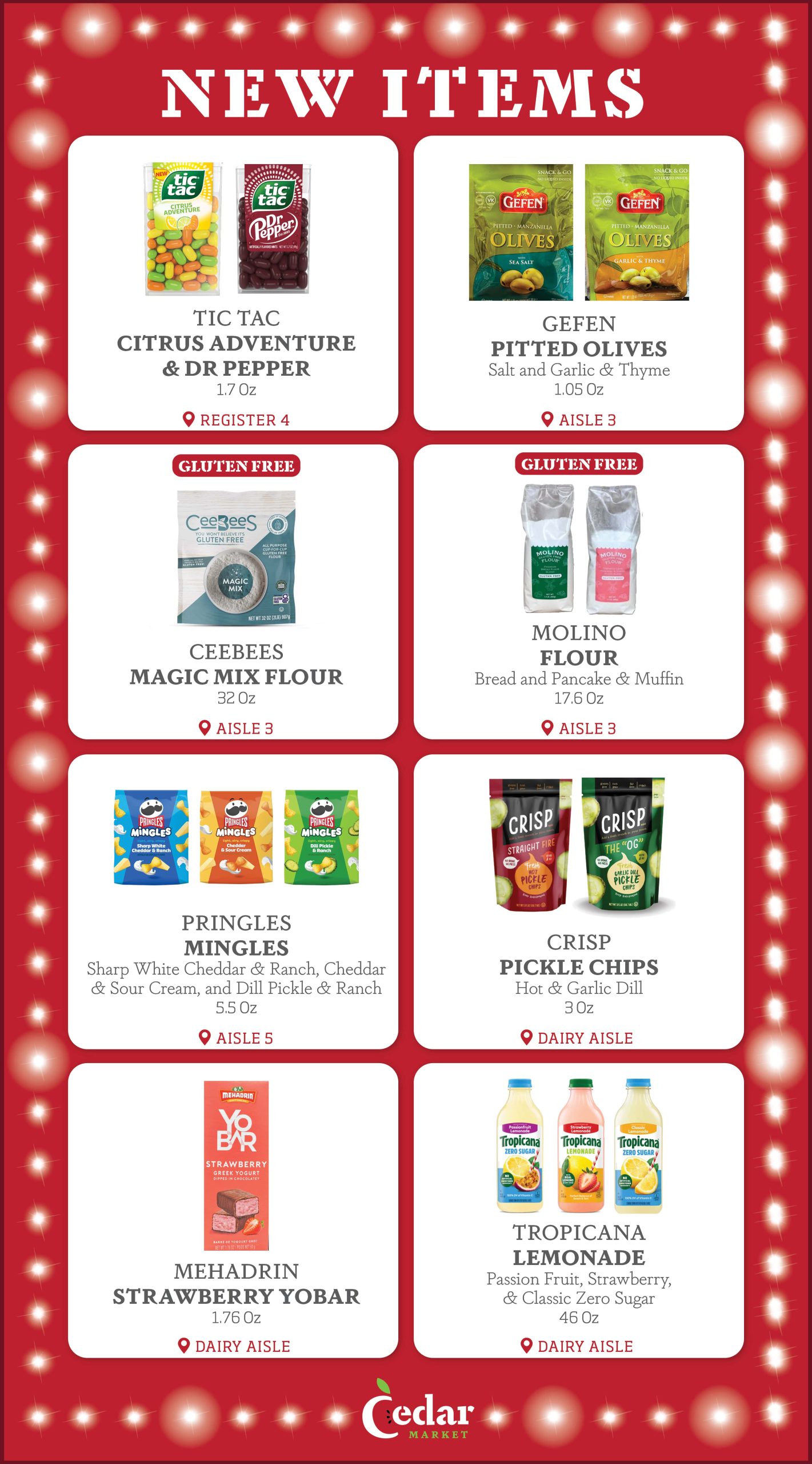 With new products constantly entering the Kosher market, the purchasing team at Cedar Market is always looking for new items to make available to you in our store. Each week, we provide our customers with a list of several New Items, now available. Additionally, we display signage in our store by the recently added new items, so that customers can see which products are new to market. Enjoy!