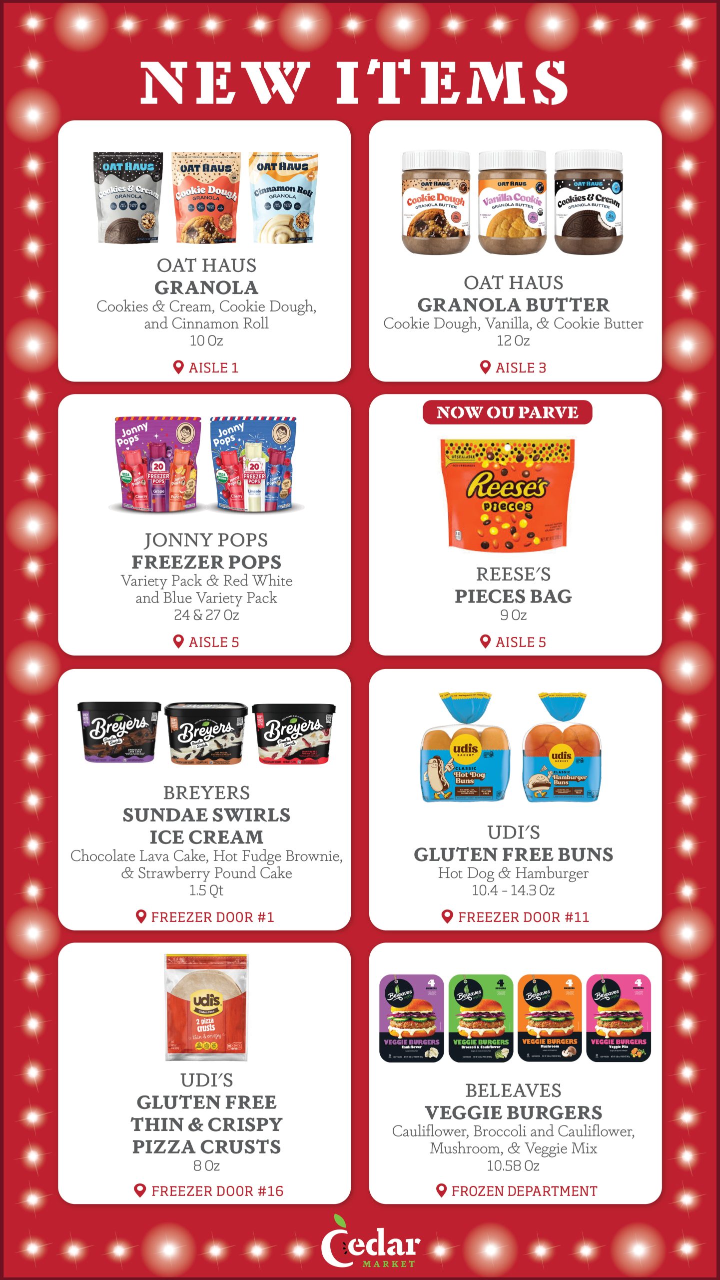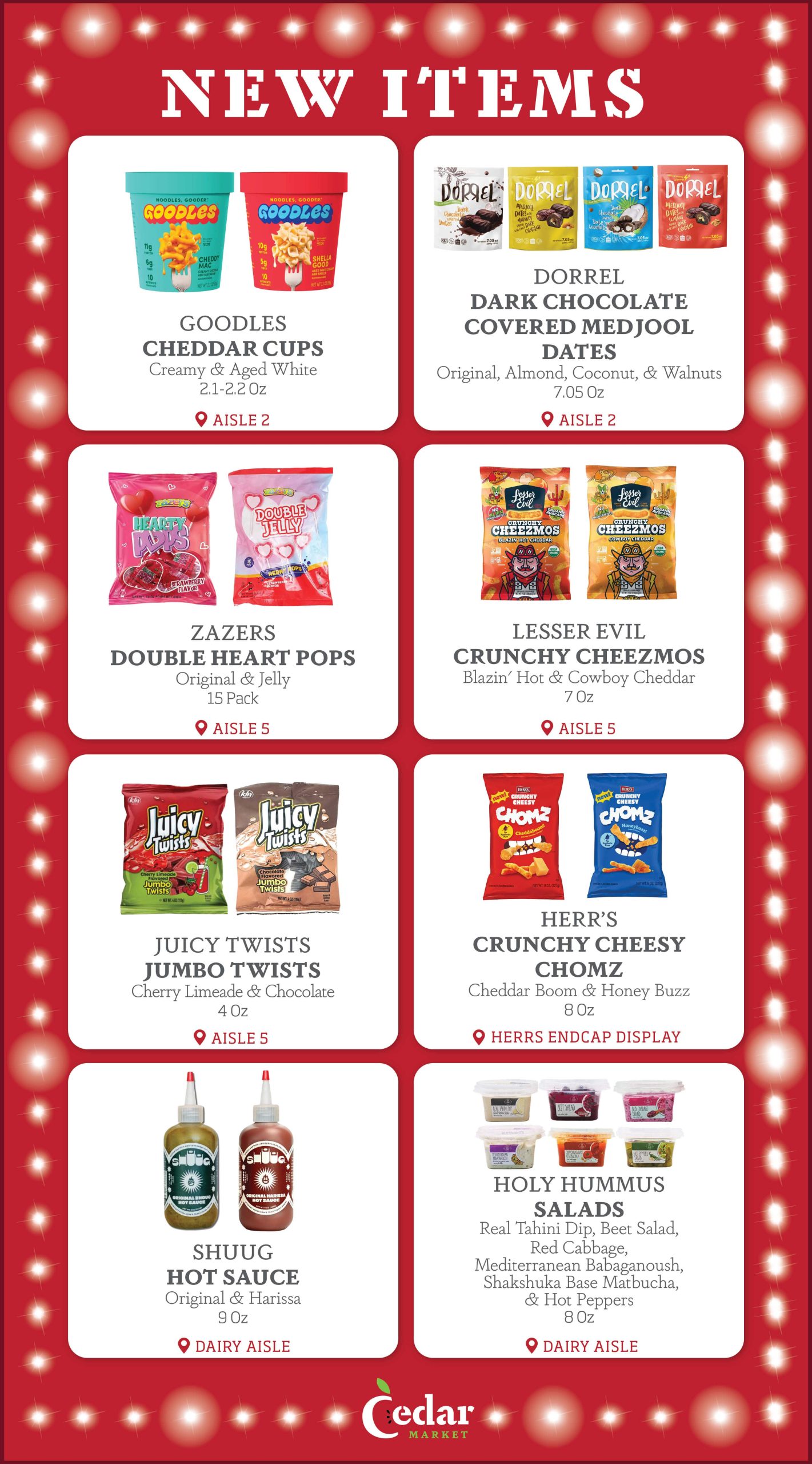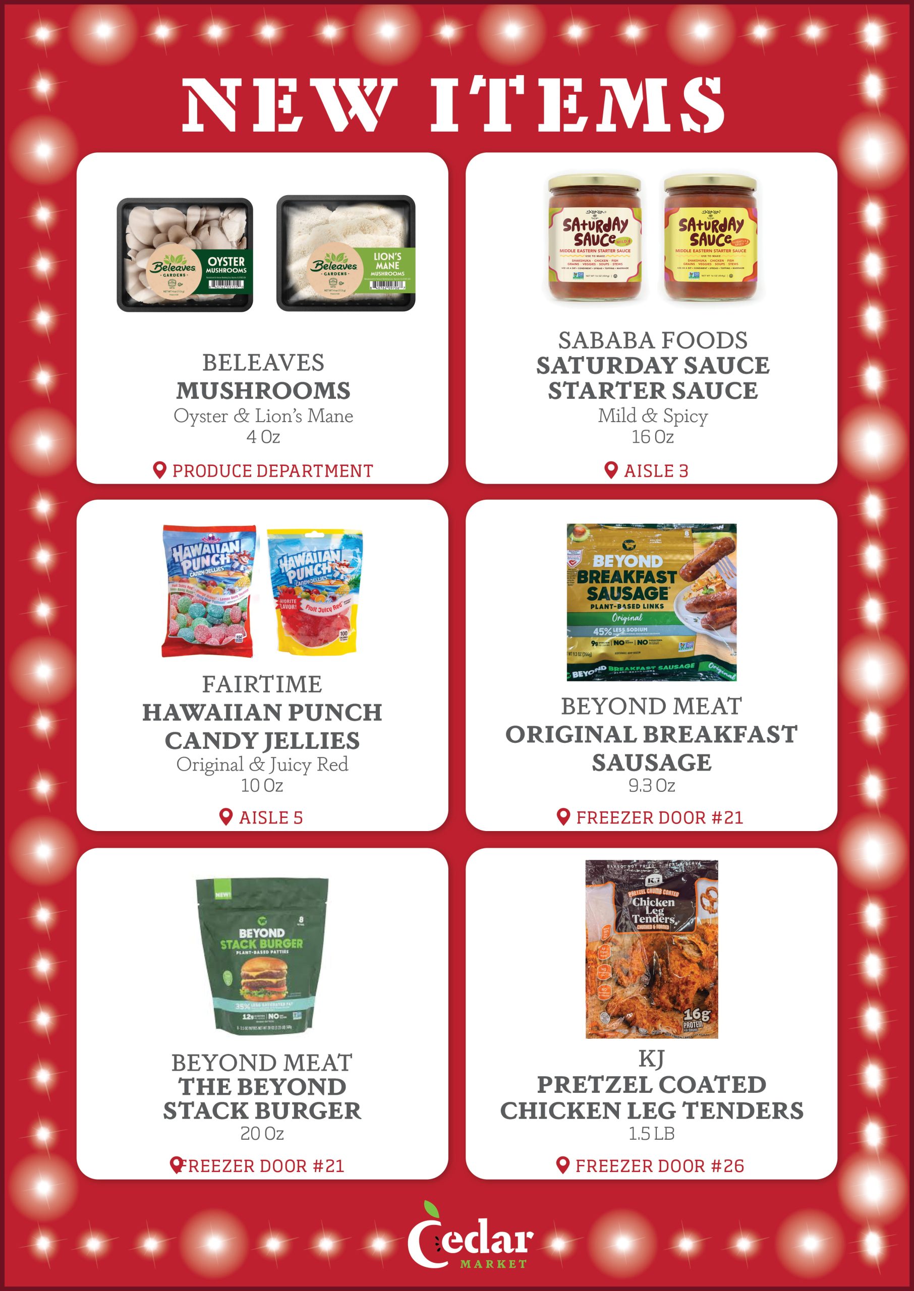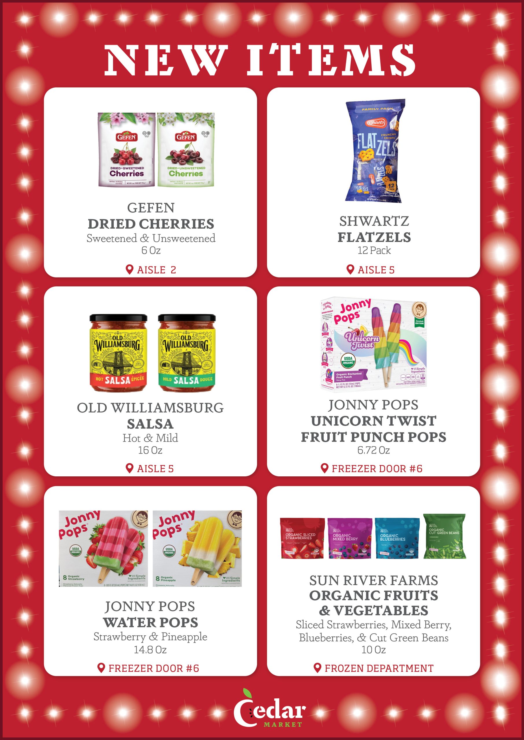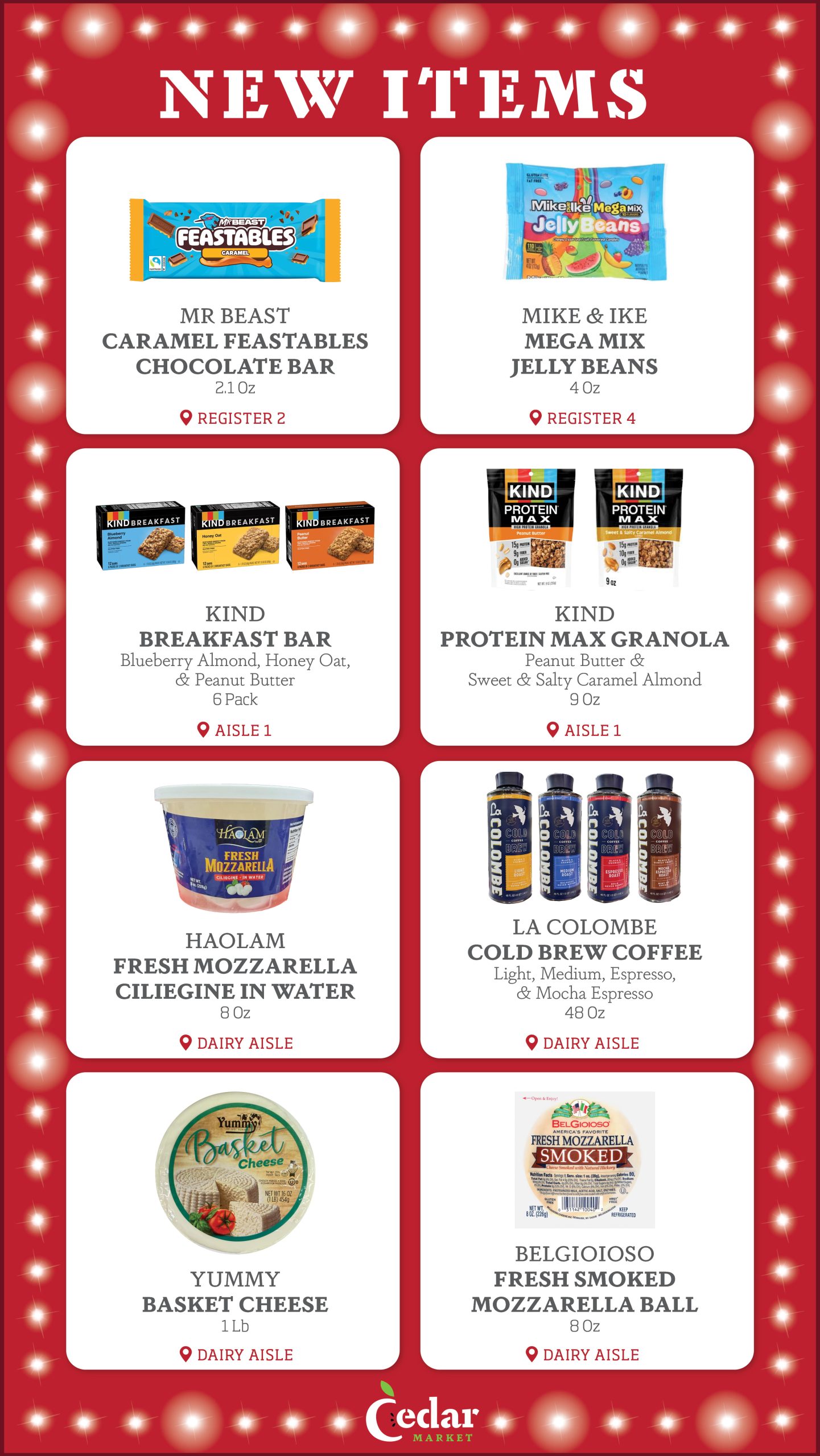 With new products constantly entering the Kosher market, the purchasing team at Cedar Market is always looking for new items to make available to you in our store. Each week, we provide our customers with a list of several New Items, now available. Additionally, we display signage in our store by the recently added new items, so that customers can see which products are new to market. Enjoy!