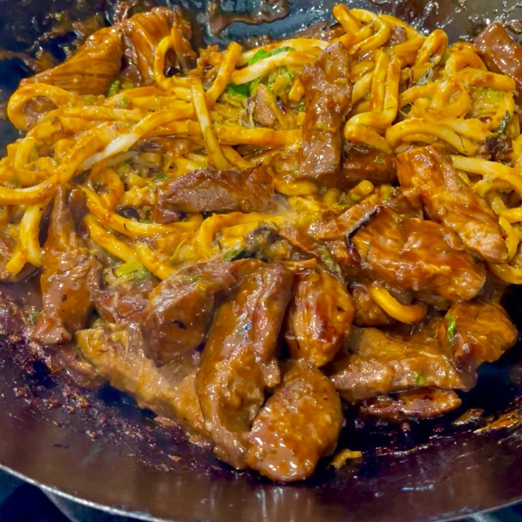 Make your sauce by adding all the ingredients together and blending. After an hour, add the beef to the hot oiled wok, and add the brown sugar, soy sauce and corn starch slurry to get it all browned and glossy. While it cooks, add your noodles to boiling water to loosen/defrost. Once they can separate easily, drain off the water.