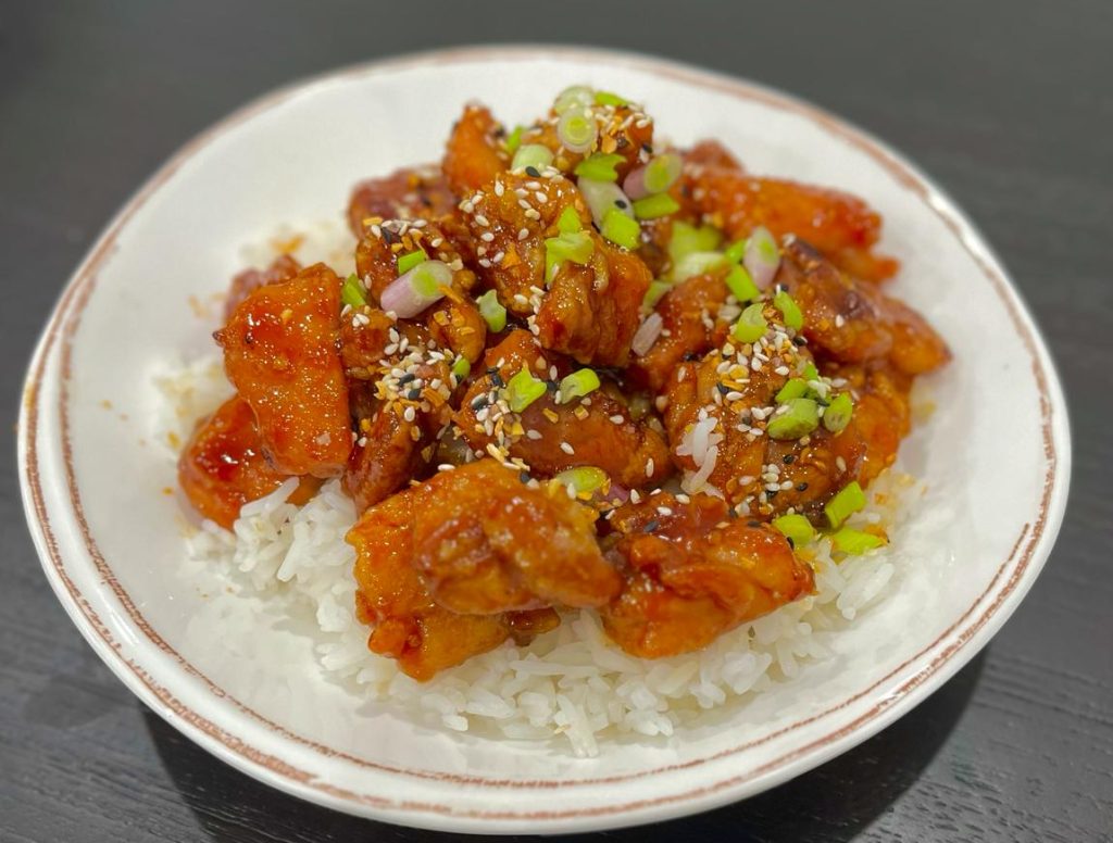 Add your sauced chicken to a bowl of rice and top with scallions & sesame seeds.